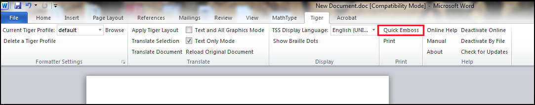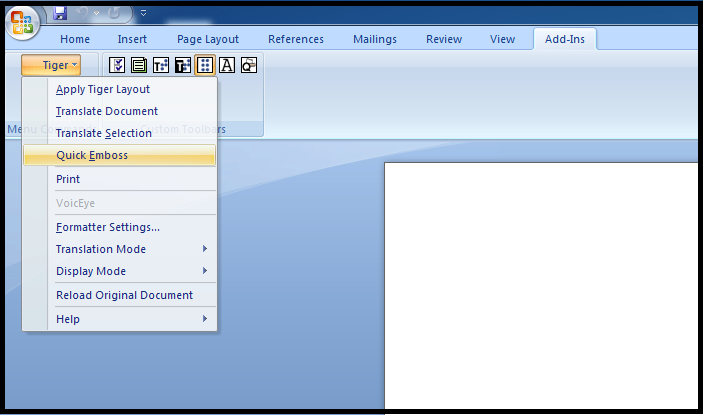 Quick Emboss is a command that, with a single click, translates the document applying the user's settings as defined in the Formatter Settings as well as sends it to the embosser selected in Add-Ins > Tiger > Formatter Settings > Document Settings in TSS 5 or Tiger > Formatter Settings > Page Layout in TSS 6.