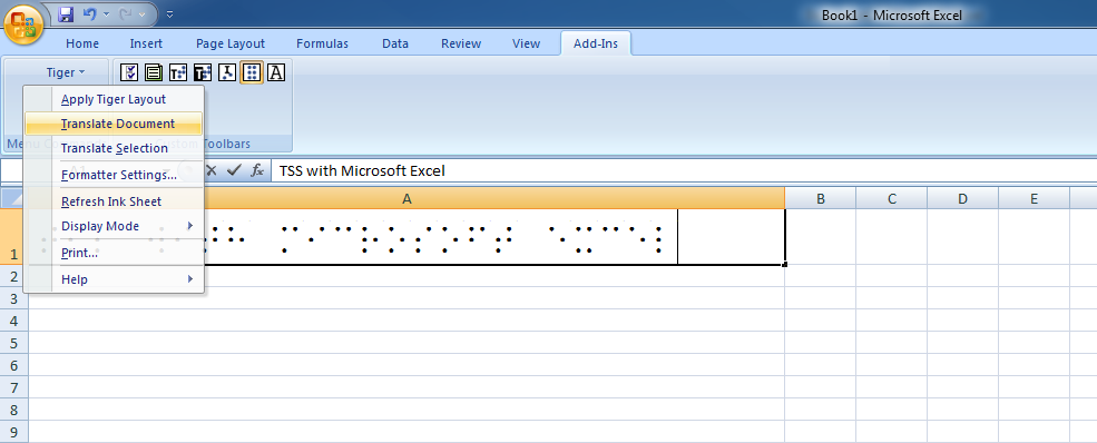 Operation of the Tiger Formatter in Microsoft Excel differs somewhat from operation in MS Word. In Excel, the Quick Emboss option is not available. Because of the nature of Excel spreadsheets, the Translation Mode selection is unnecessary and does not show in the Tiger menu.
